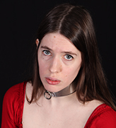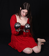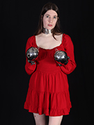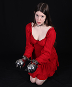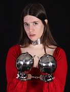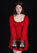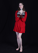 The beautiful elf-like Ivy Red is back! I locked her in a big collar, it looks so good on her slender neck! Ivy is a real life submissive and she is just the cutest in her little pink dress. She is very used to wearing handcuffs, but I added a few more things! Thumbcuffs are always interesting, as well as locking her handcuffs to her collar. This created a very limiting position, which Ivy actually liked very much!